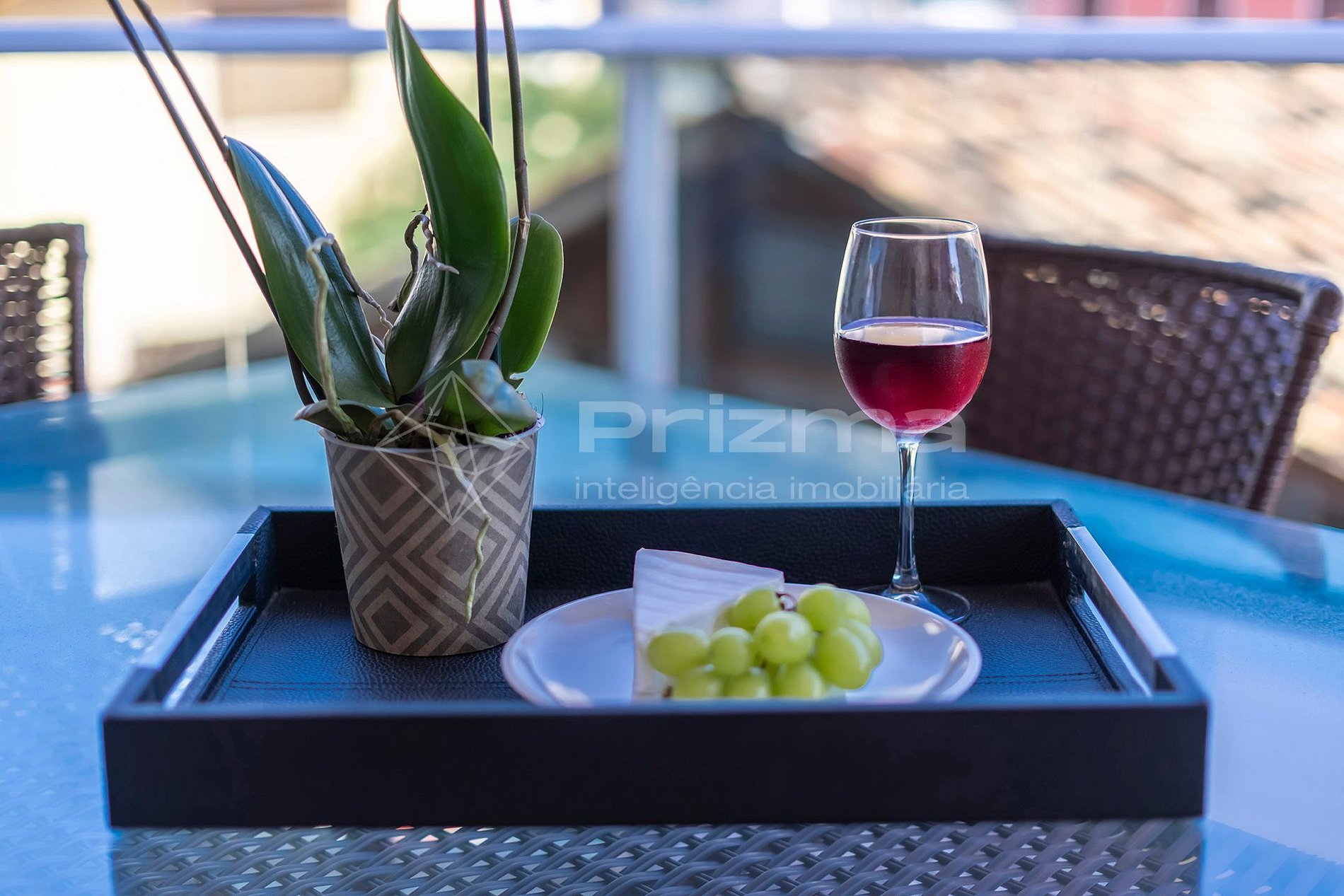 -Sacada com churrasqueira a carvão, mesa para 06 pessoas e vista para a rua lateral;