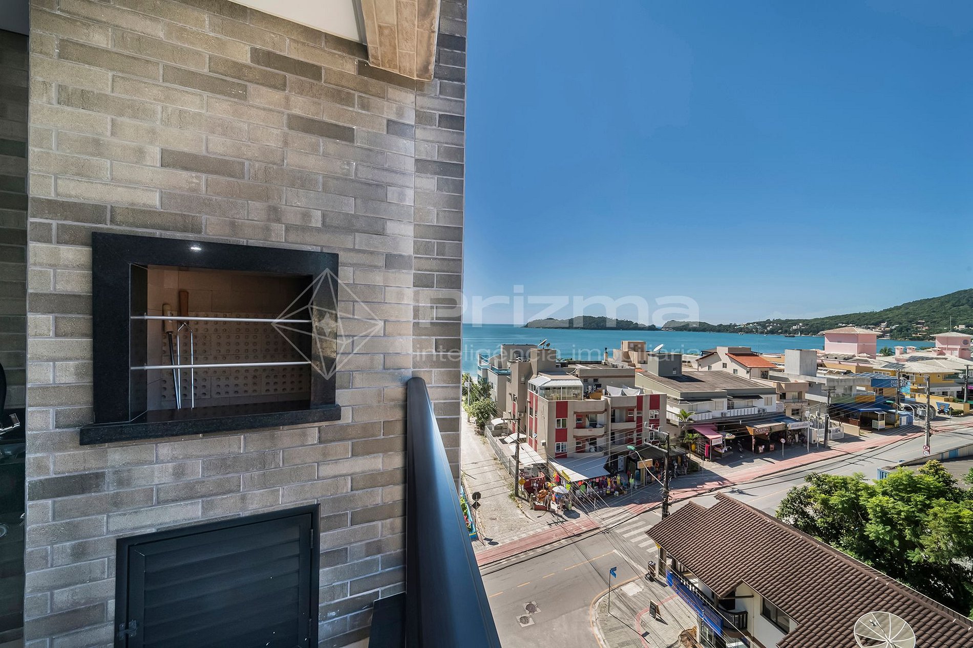 -Sacada com vista lateral para o mar e churrasqueira a carvão.