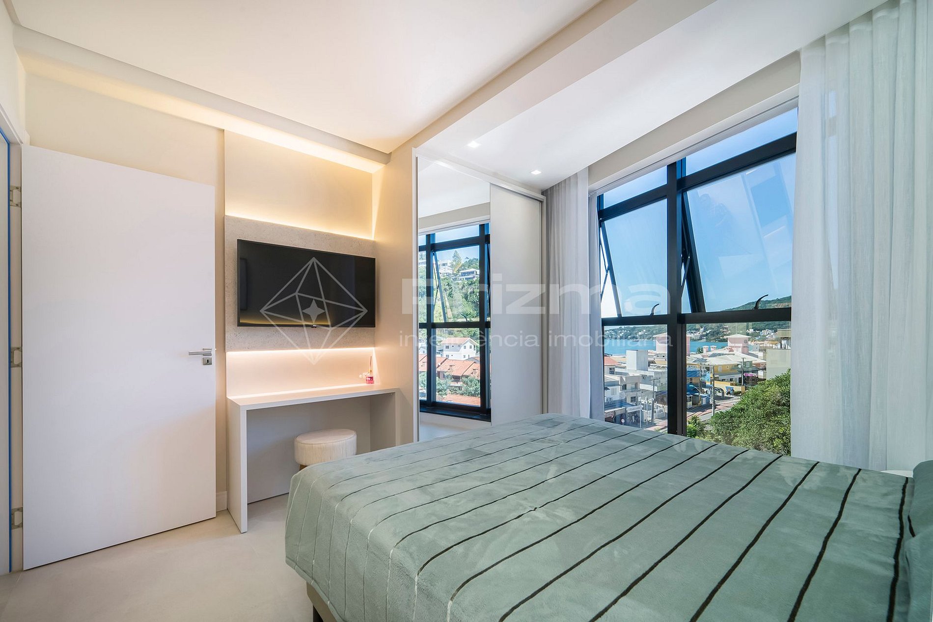 -Quarto 01: Suíte com cama queen size, TV, ar condicionado e vista lateral para o mar;