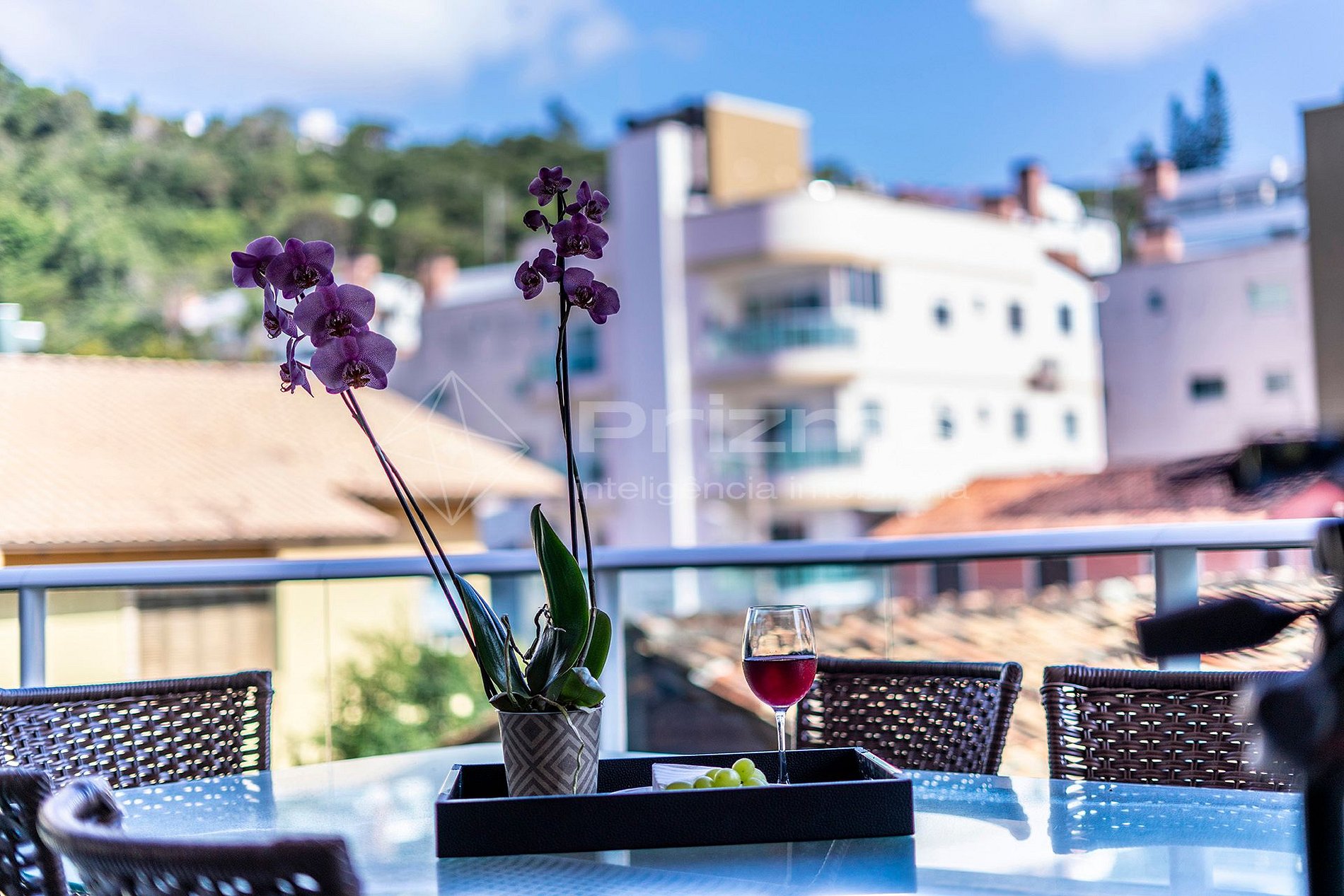 -Sacada com churrasqueira a carvão, mesa para 06 pessoas e vista para a rua lateral;