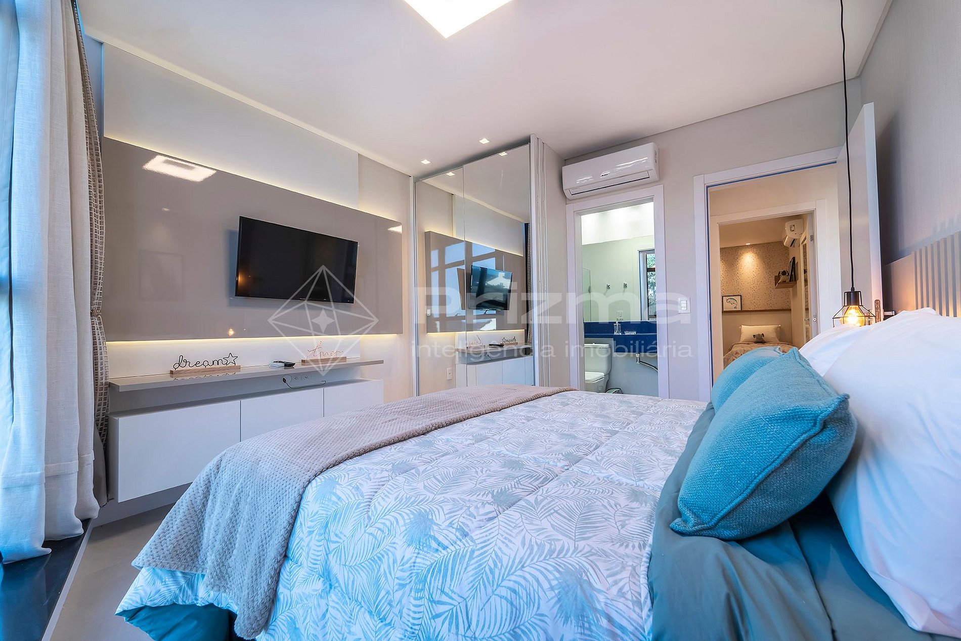 Dormitorio 01: Suite con cama queen size, TV y aire acondicionado;