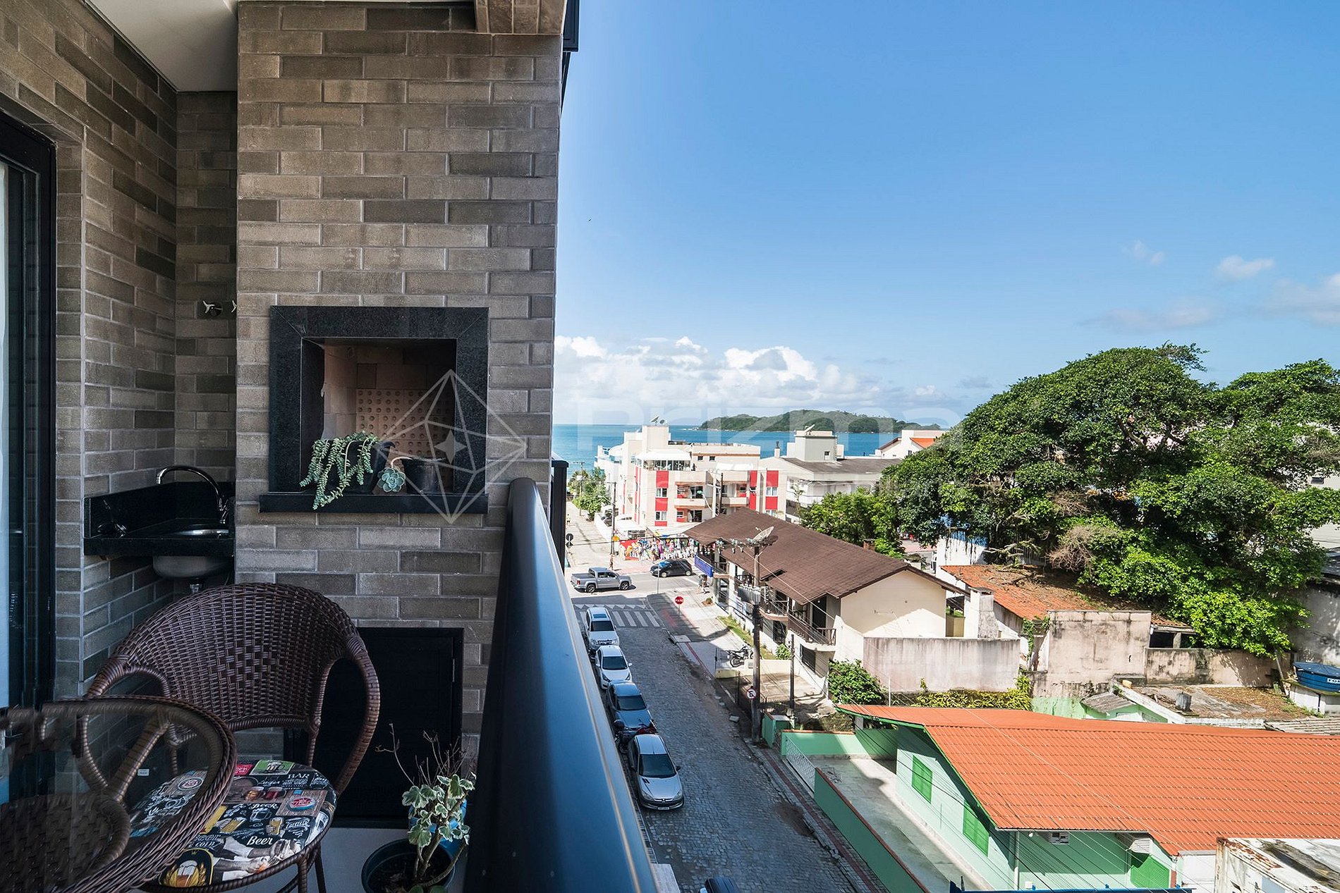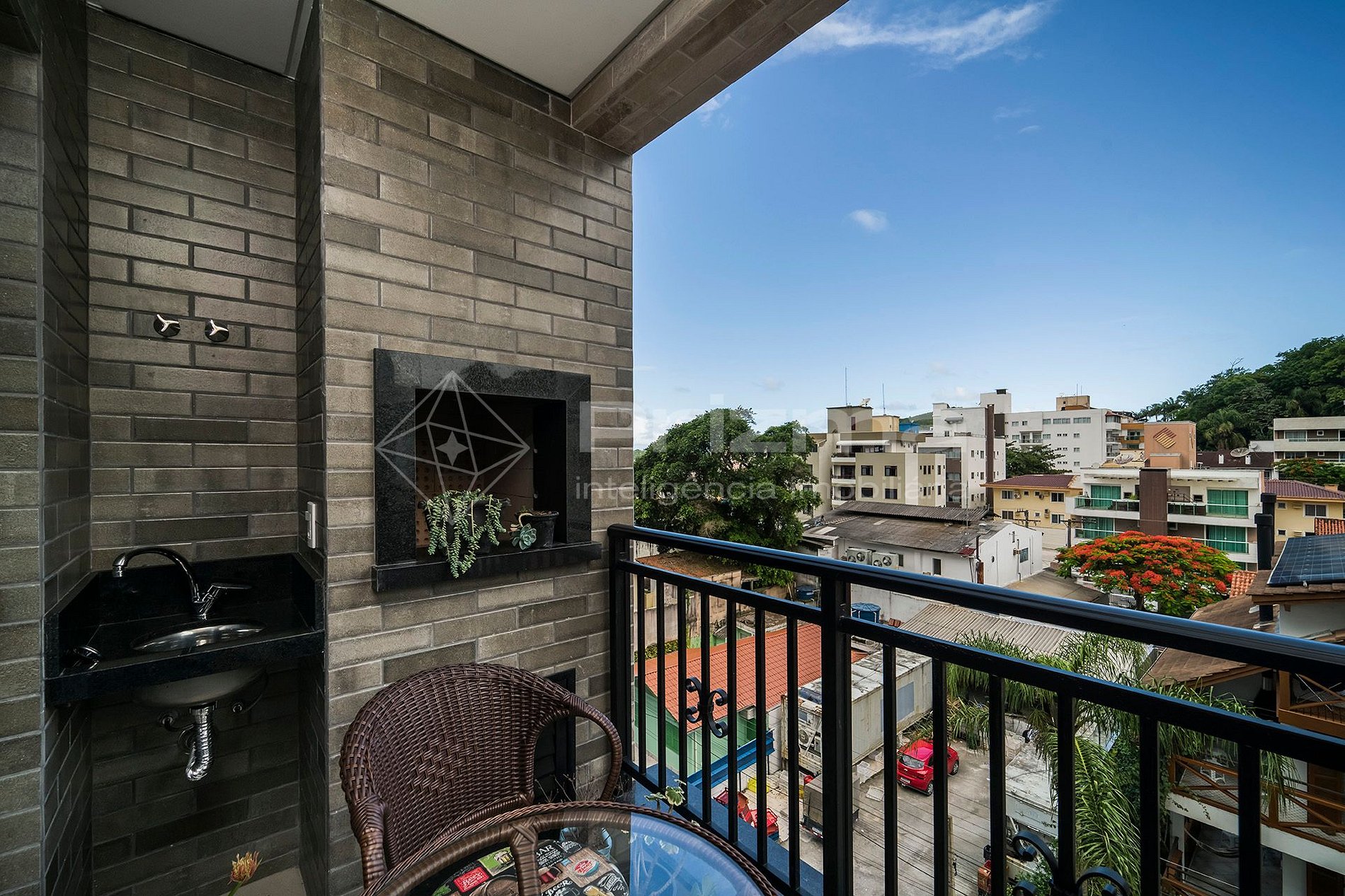 -Sacada com vista para a rua lateral e churrasqueira a carvão.
