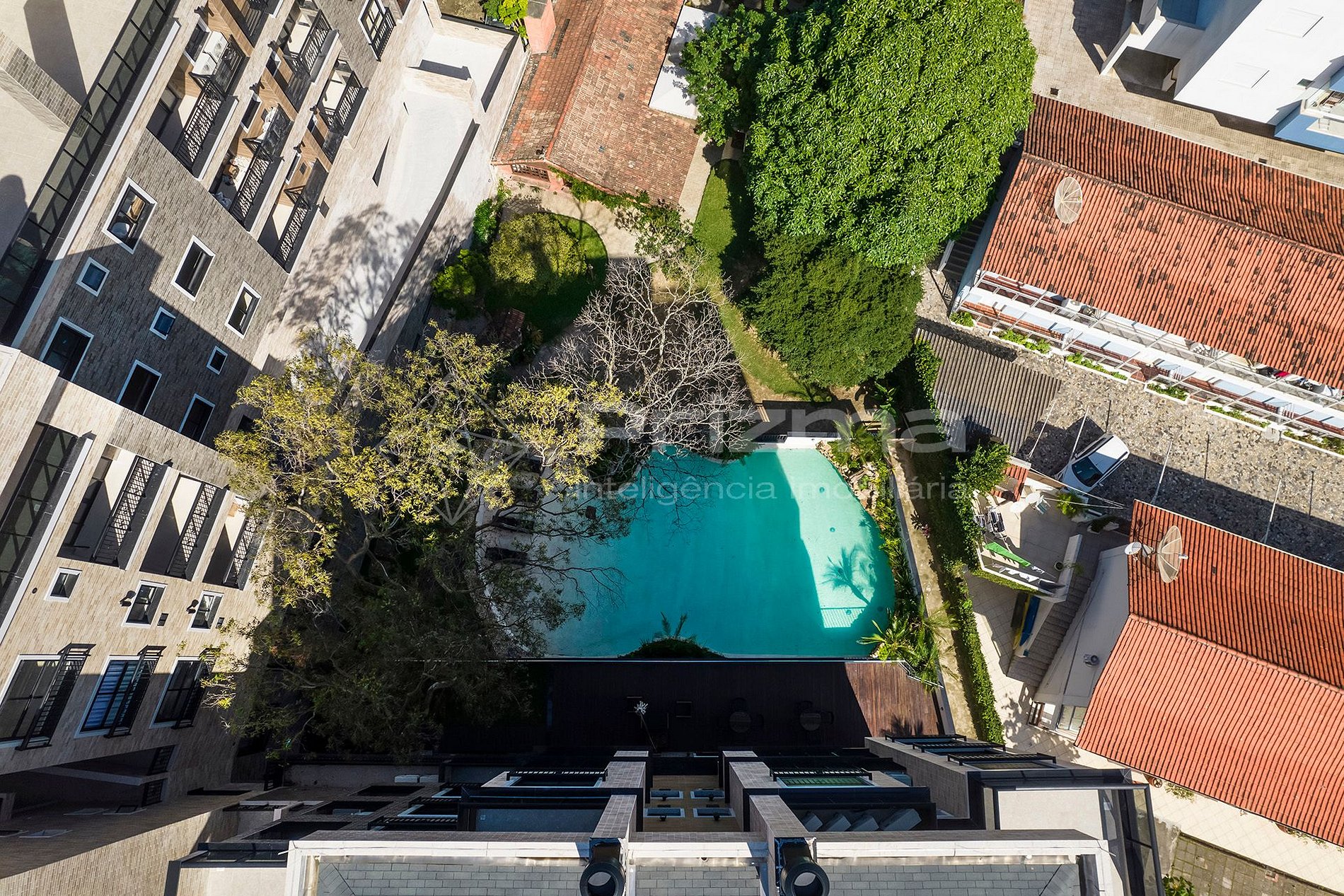 -Sacada com vista para piscina e churrasqueira a carvão.