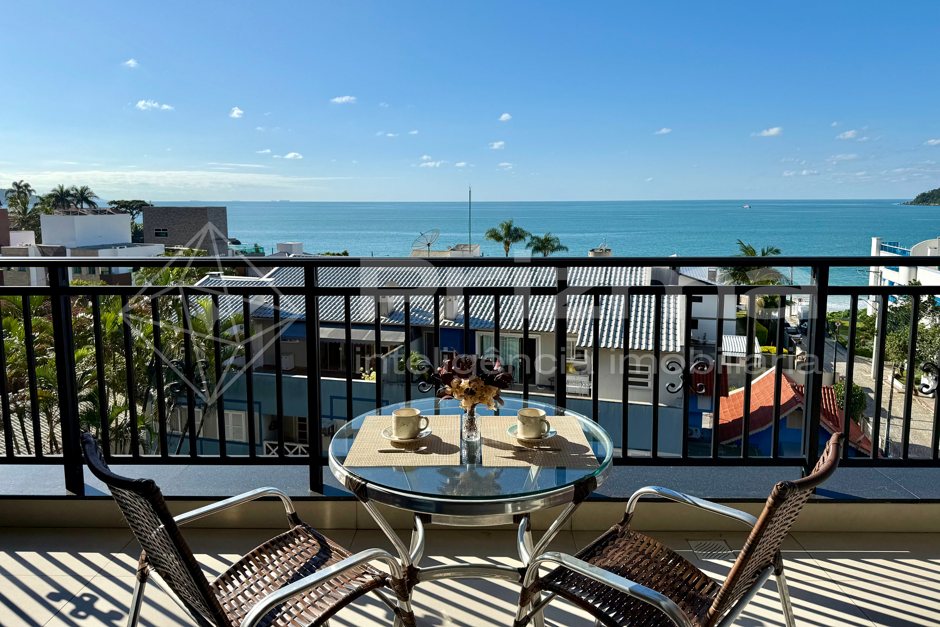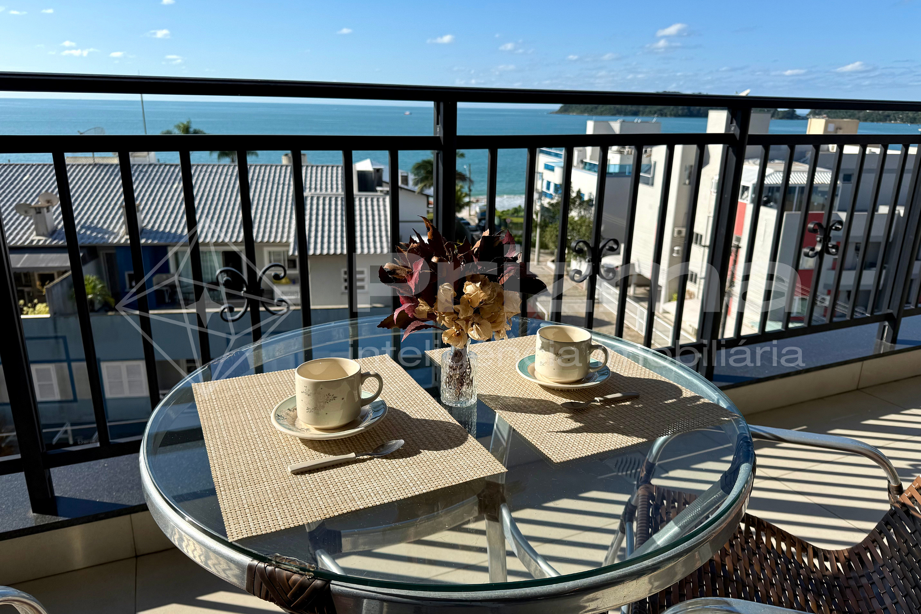 -Ampla sacada com vista para o mar e churrasqueira a carvão.