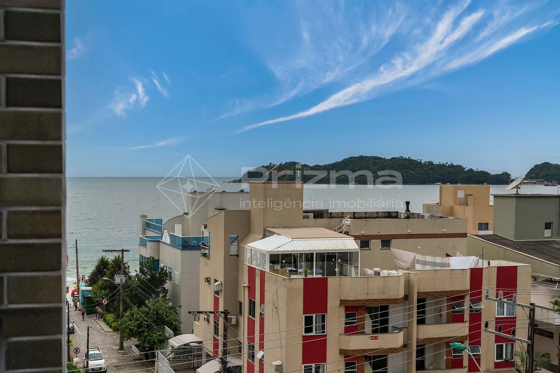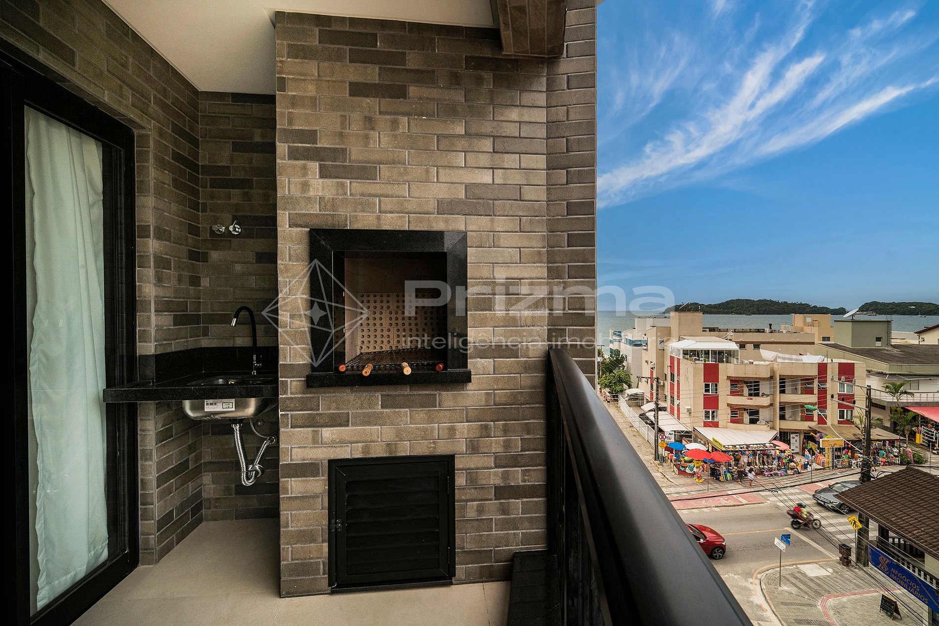 -Sacada com vista lateral para o mar e churrasqueira a carvão.