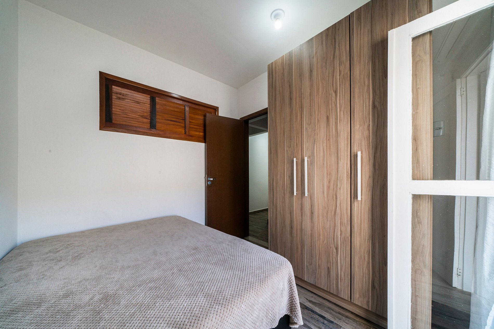 3 quartos, sendo o primeiro uma suíte com cama de casal, o segundo com outra cama de casal e o terceiro com uma cama de solteiro e uma cama auxiliar.