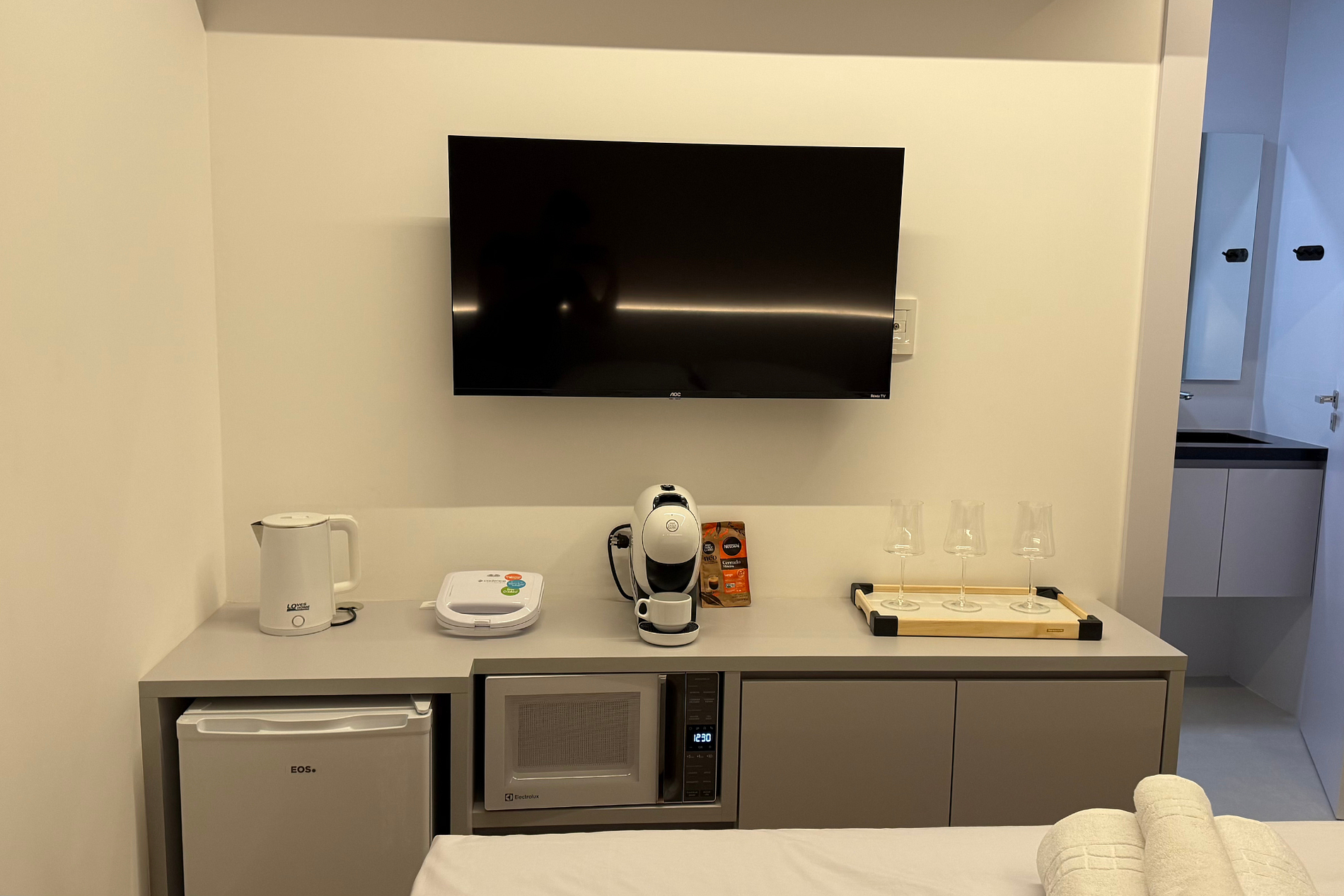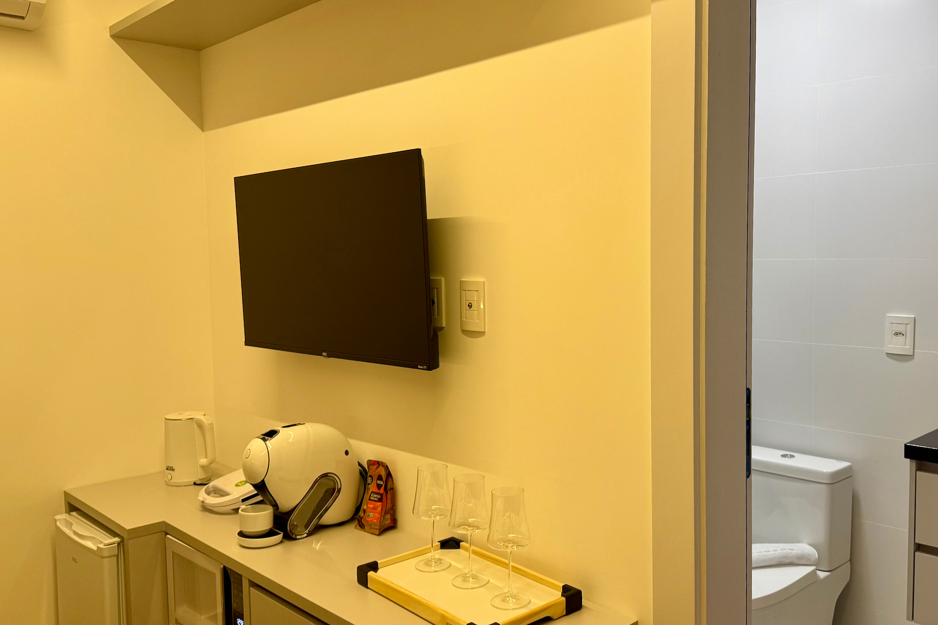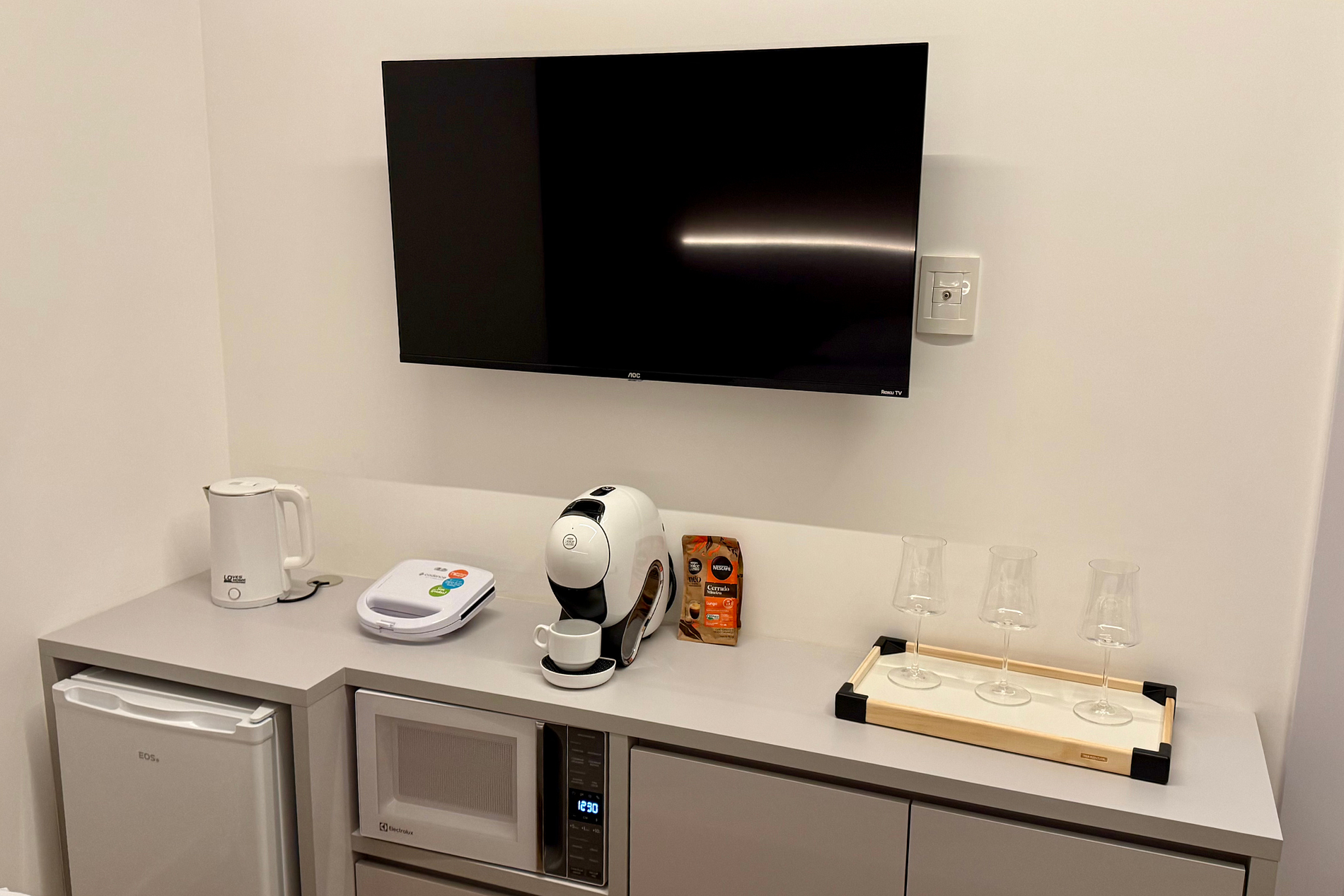 -Frigobar, chaleira elétrica, microondas, cafeteira com cápsulas;