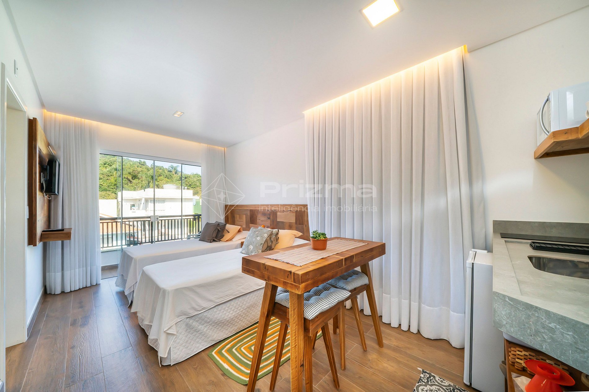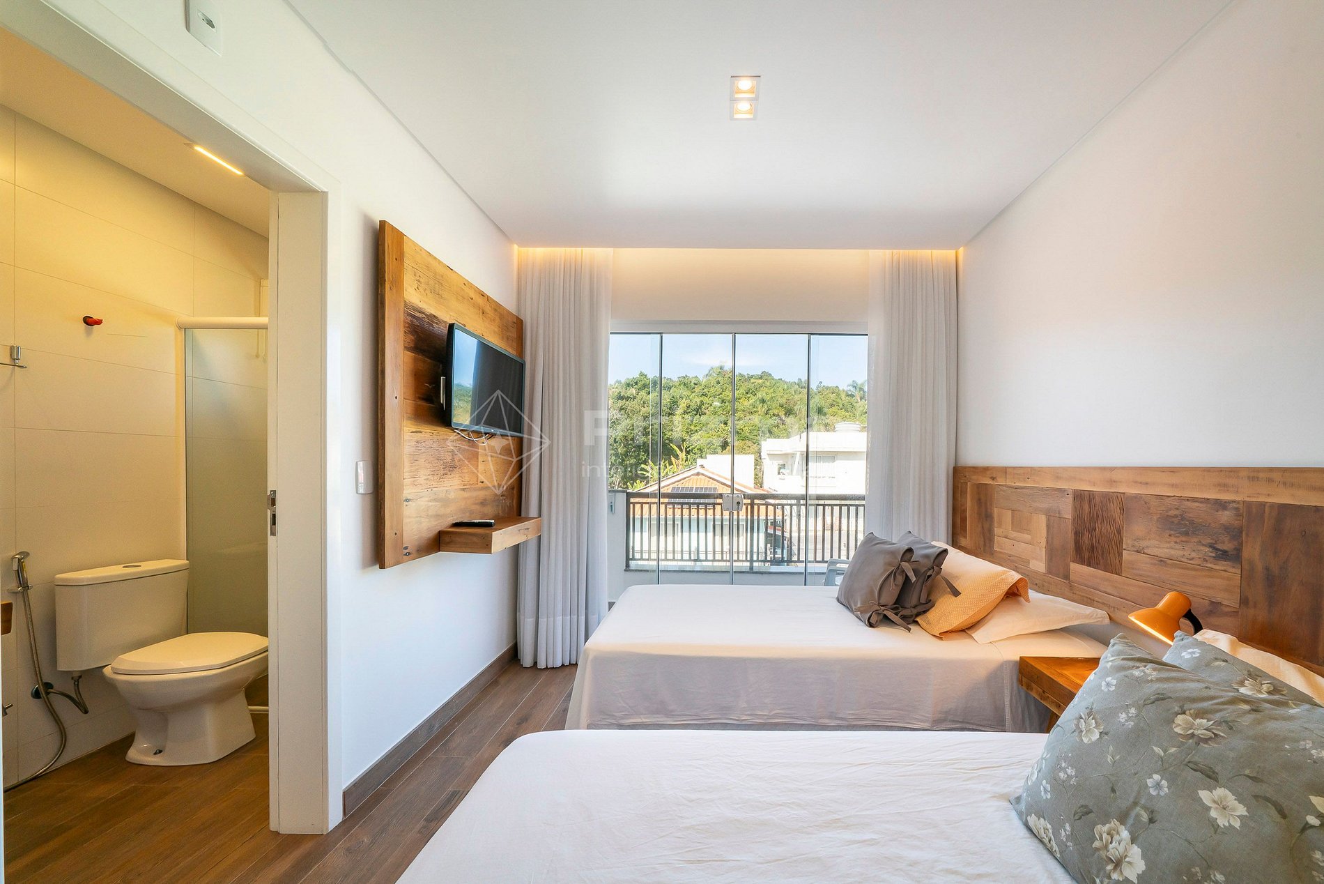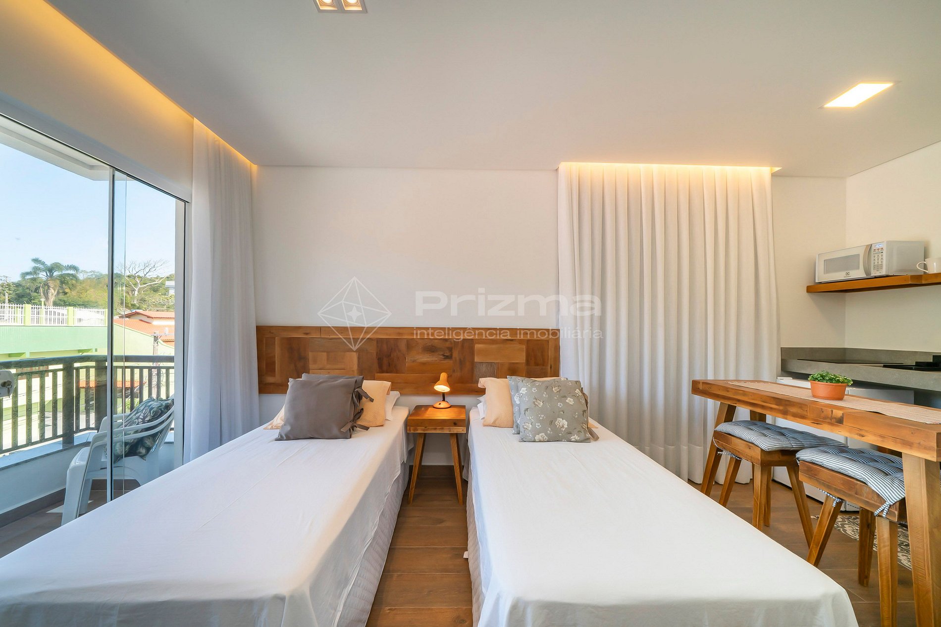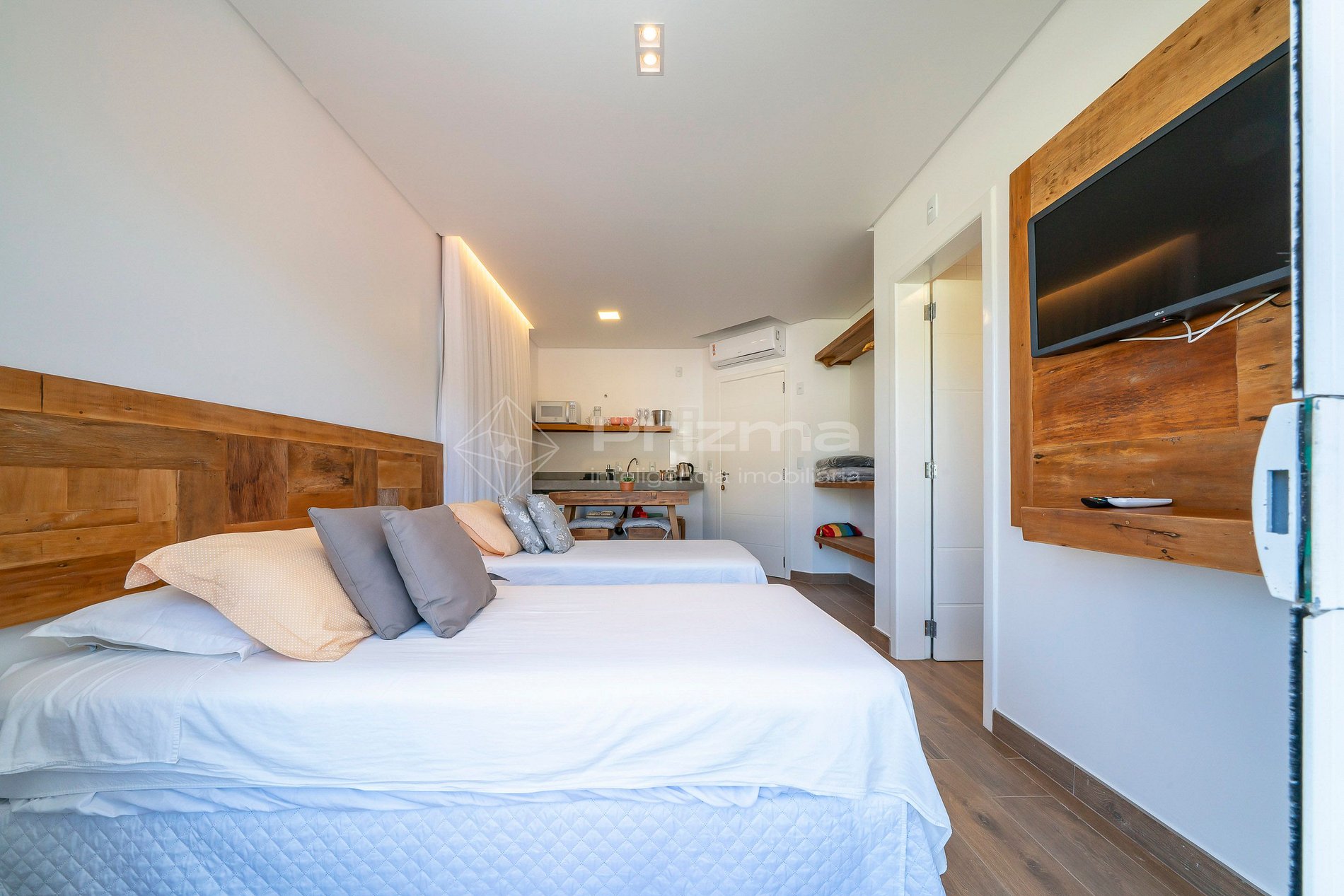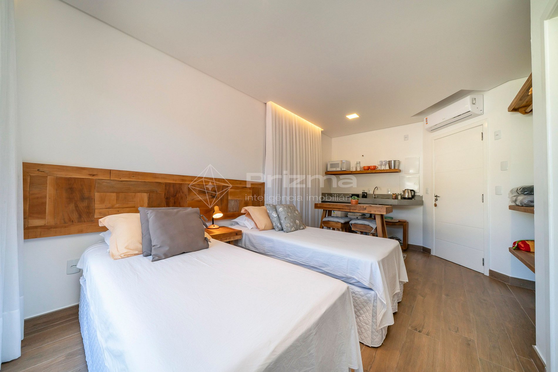 -Duas camas individuais com possibilidade de serem unidas e formar uma cama Queen;